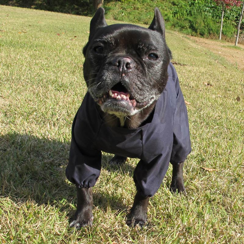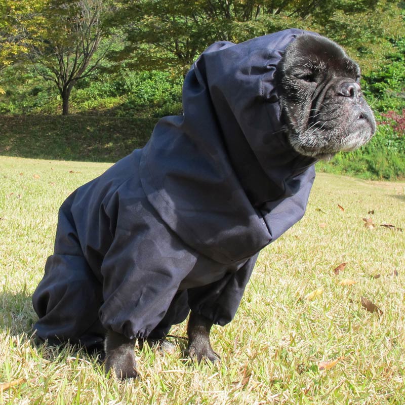 大雨でのお散歩には不向きだけど、小雨お散歩にはピッタリの着脱ラクチンレインコートです。