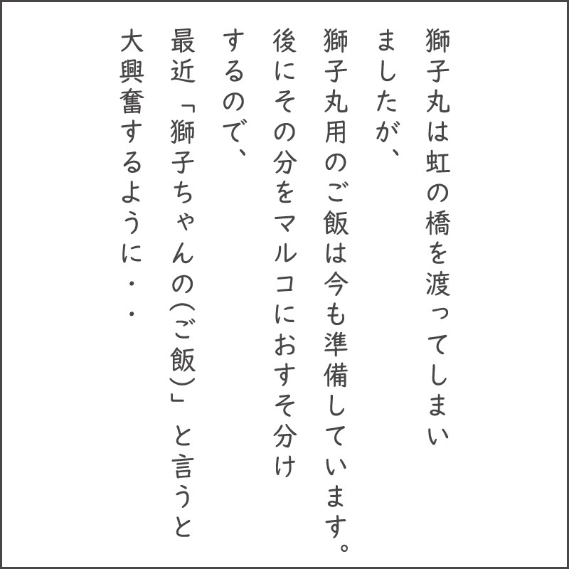 虹の橋で皆さんのお褒めの言葉を待っていると思うので、お声かけ下さると嬉しいです。
